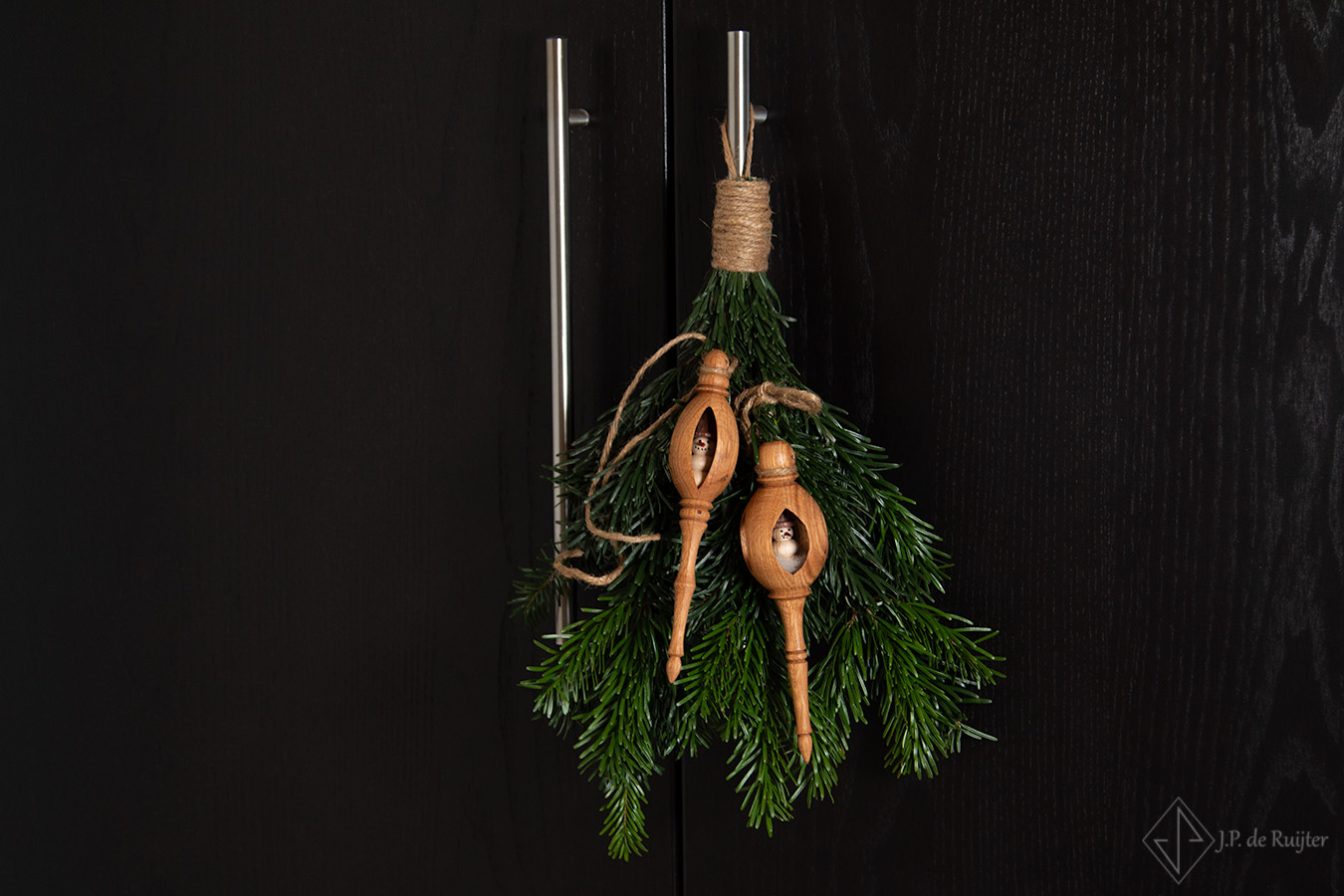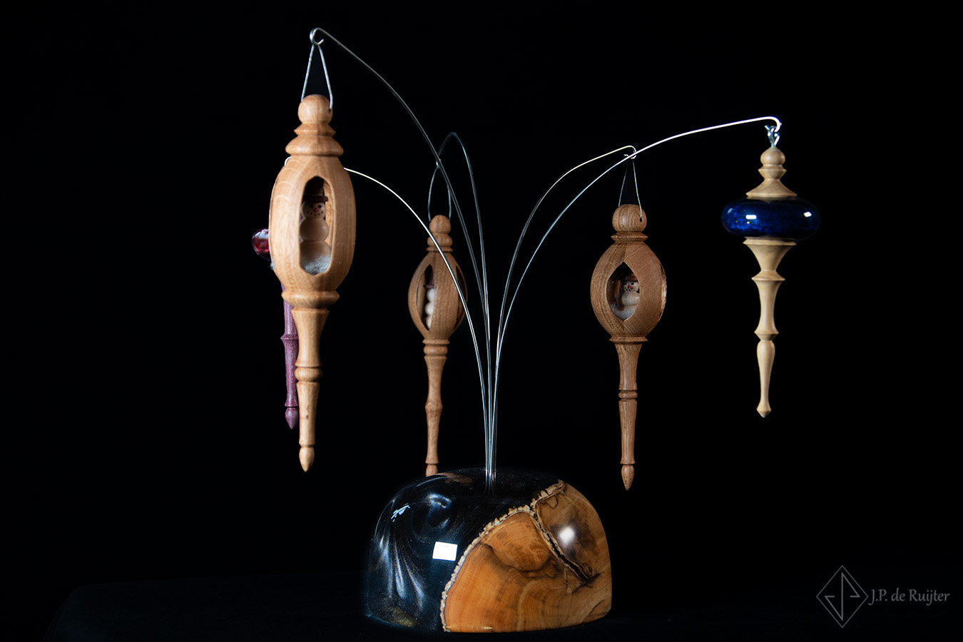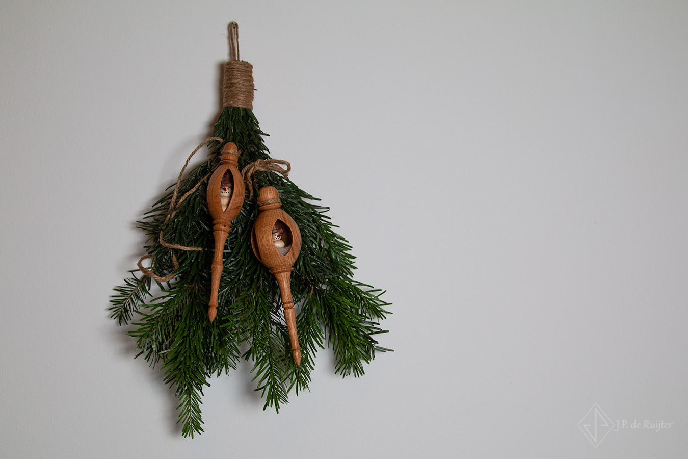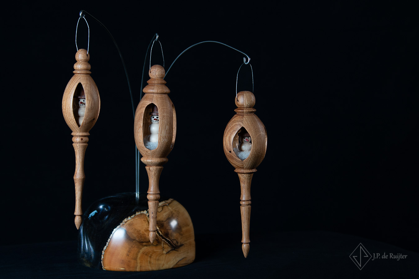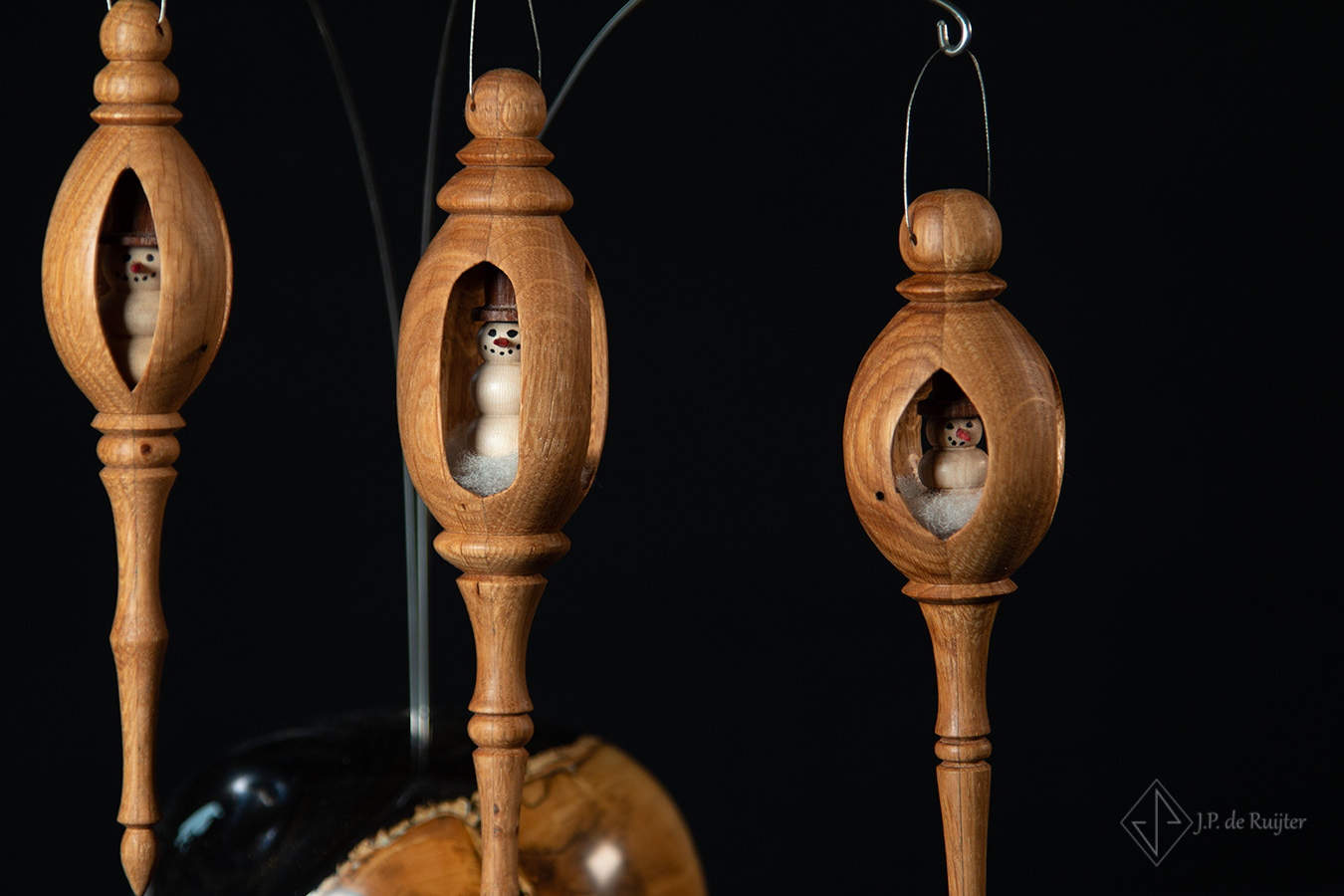 Opengewerkt Kerst ornament hanger met sneeuwpop. Gemaakt van eikenhout, sneeuwpop van plataan en mahonie. Een exclusief ornament, handgemaakt en uniek.