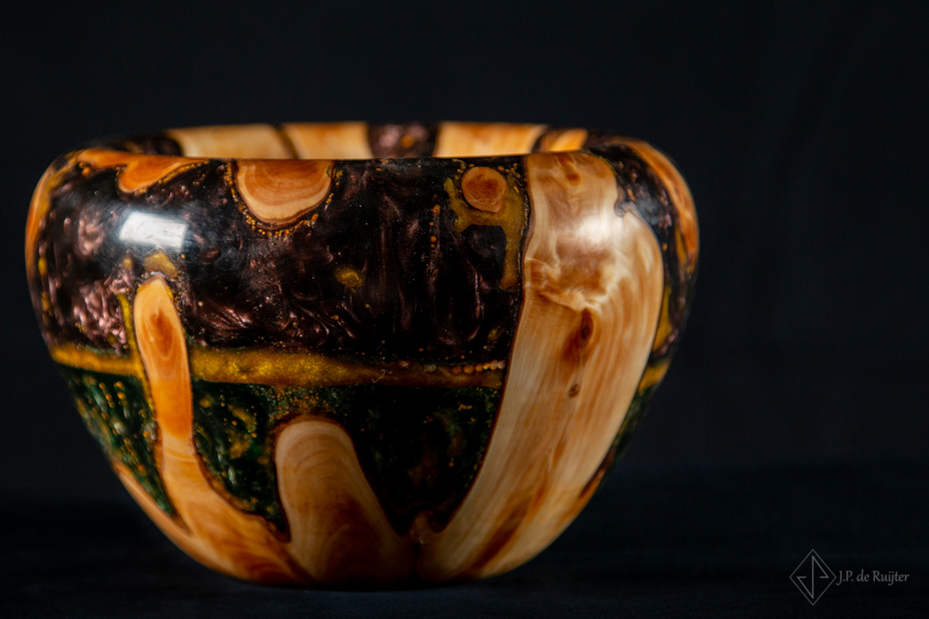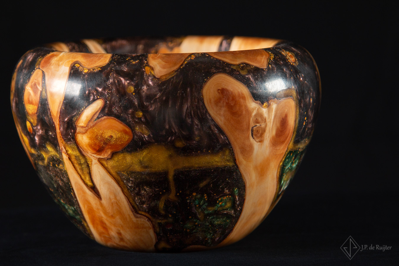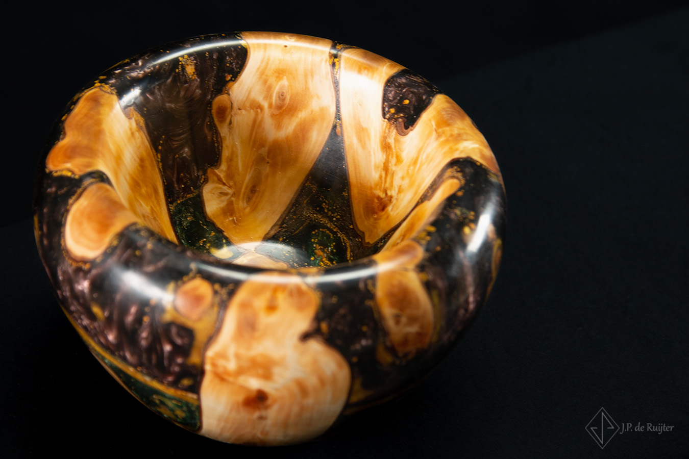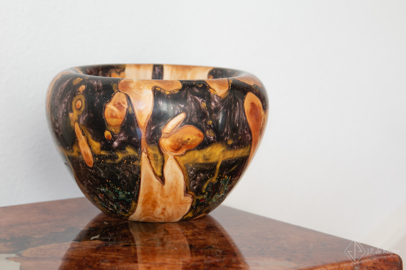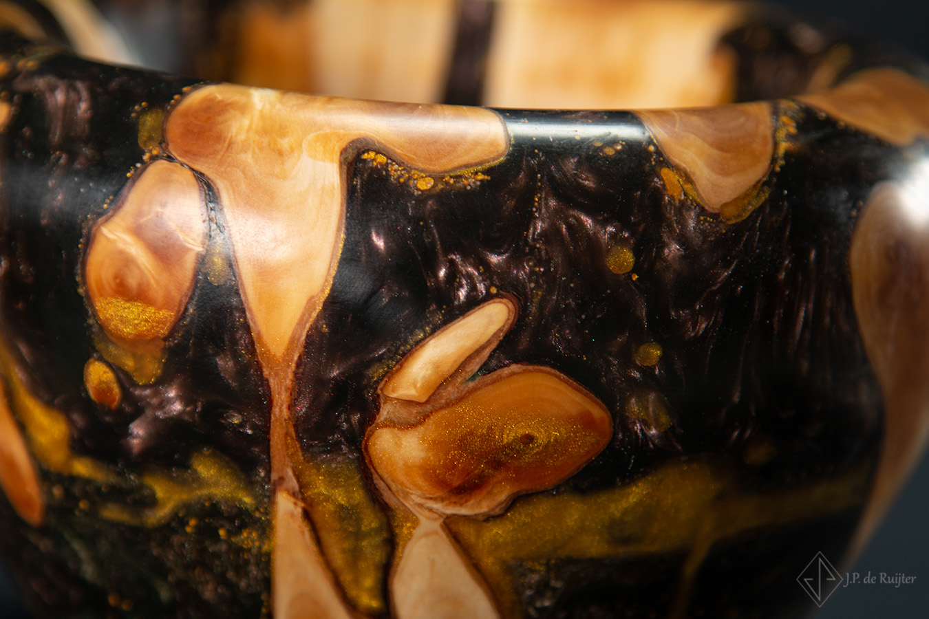 In het hout ook wel thuja of levensboom genoemd zitten prachtige tekeningen. Aangevuld met lagen in diverse kleuren epoxy en goud accenten.
