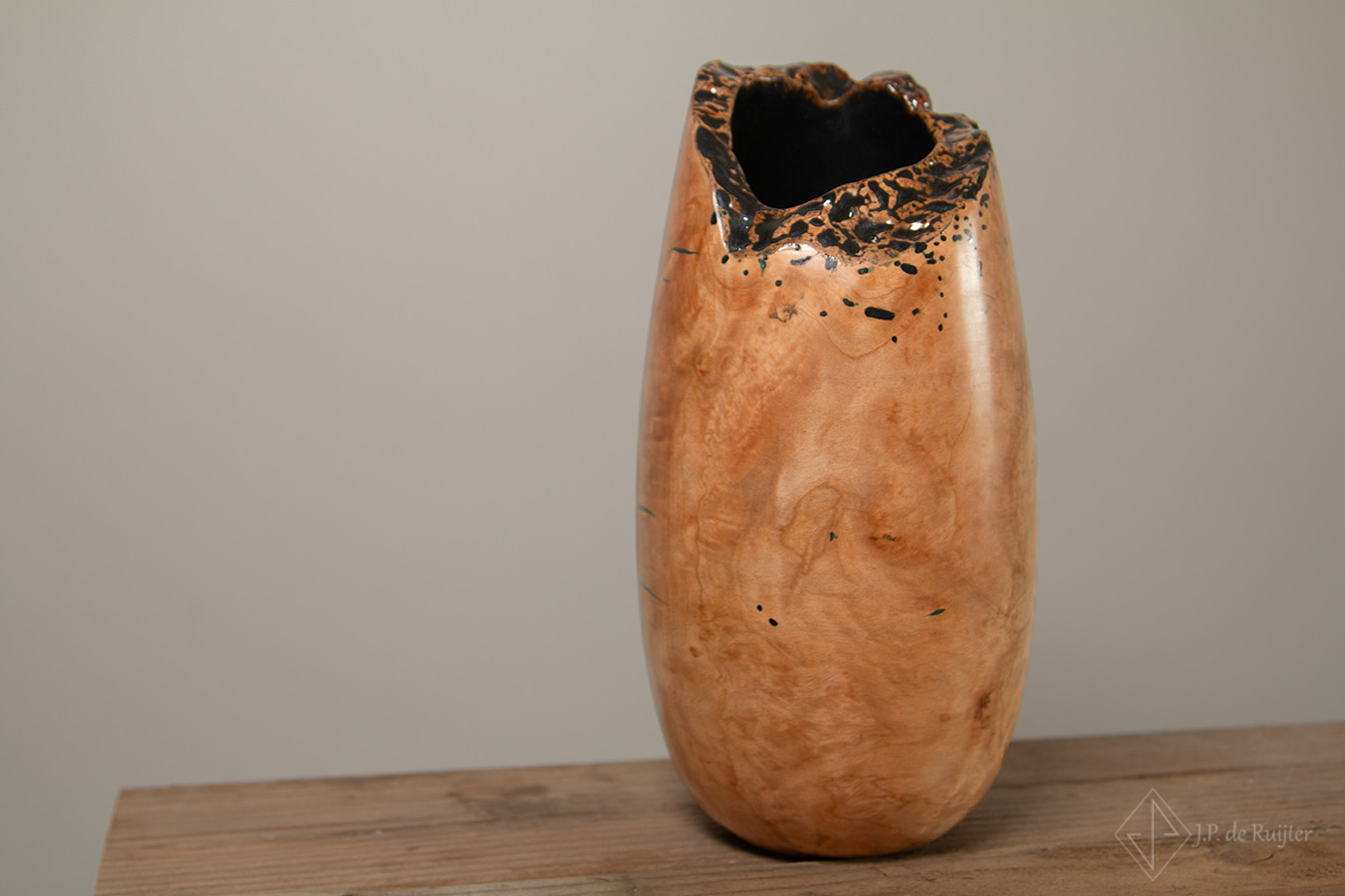 Door de mooie ovale vorm en de natuurlijke rand. Daarnaast gevuld met zwarte epoxy en de rand met zwarte accenten maakt deze vaas uniek.