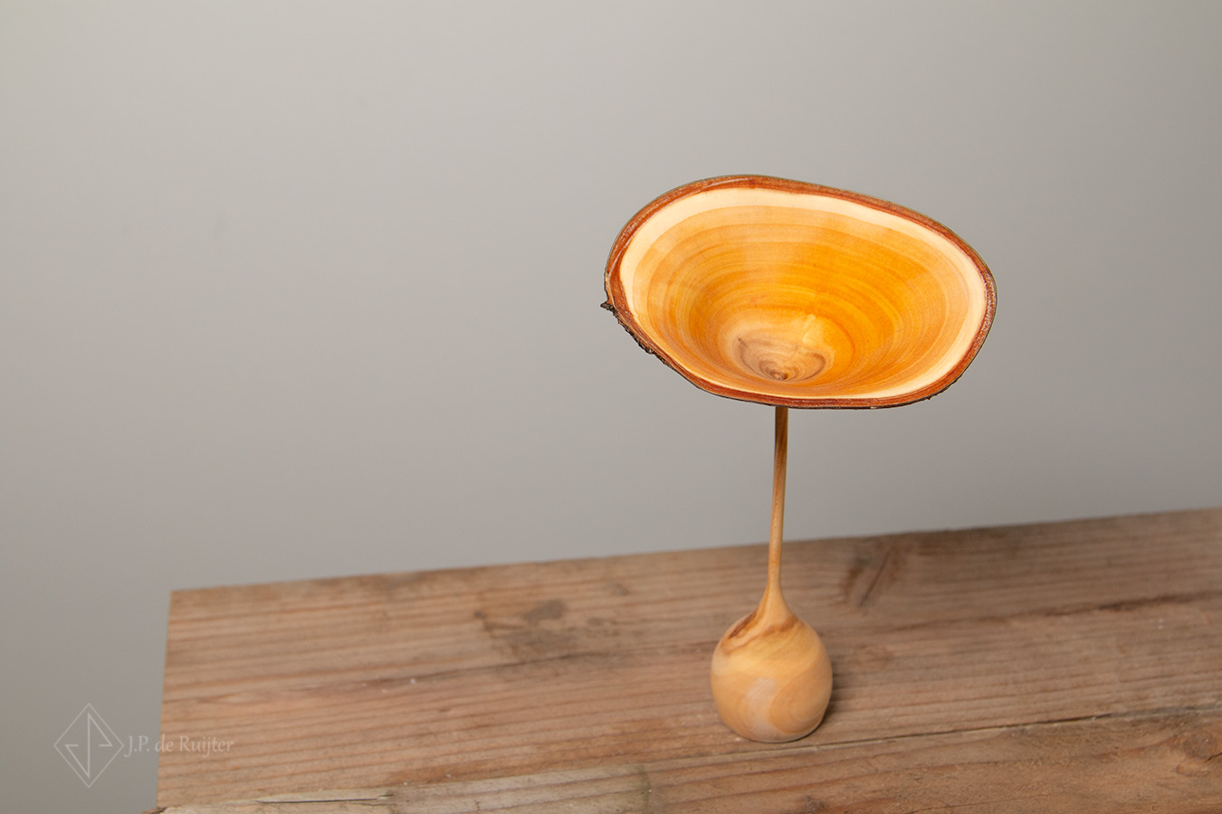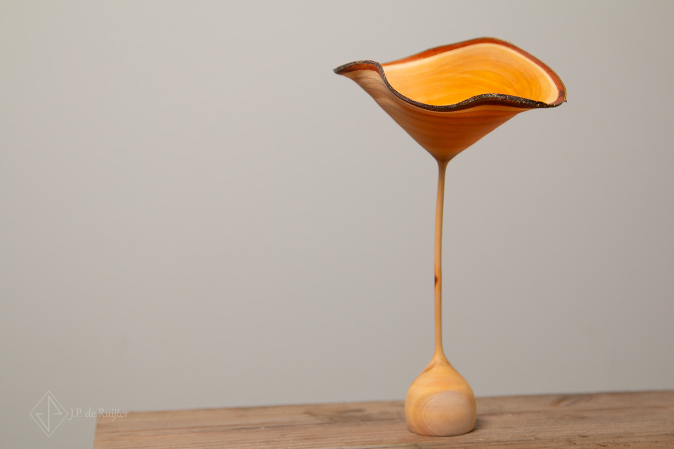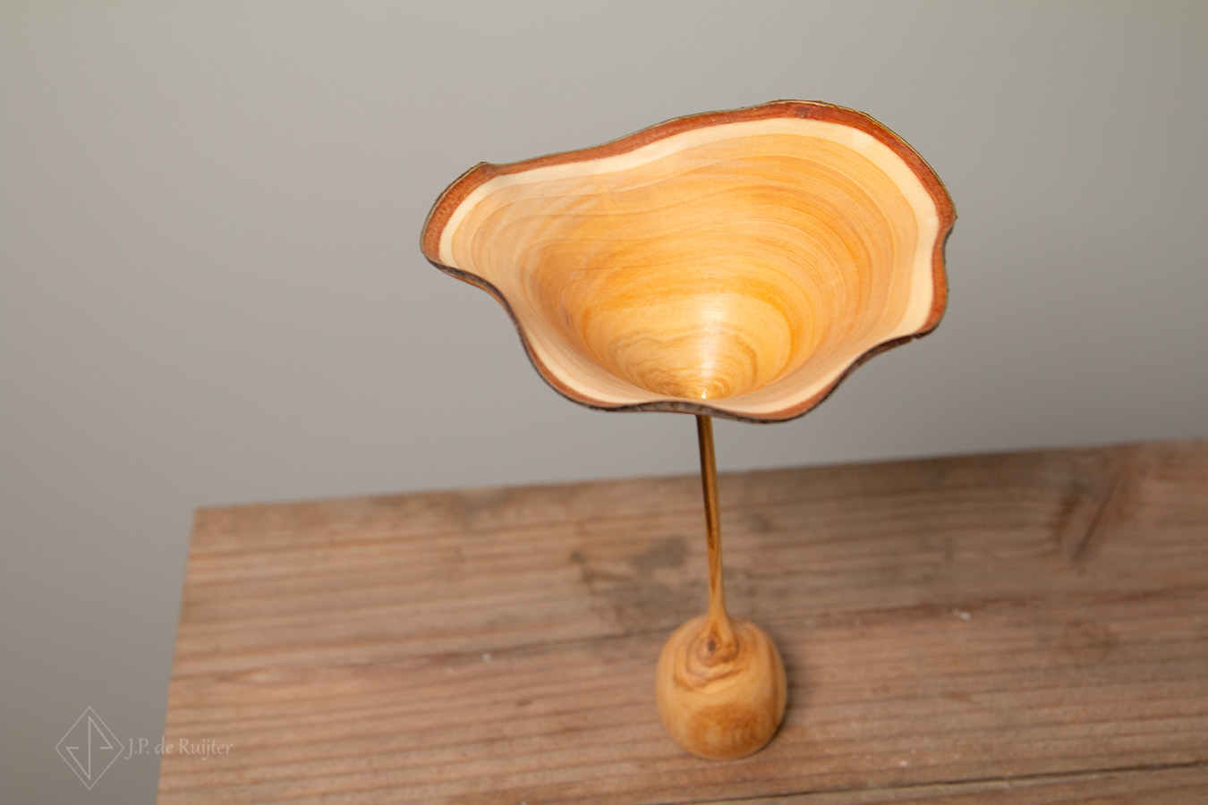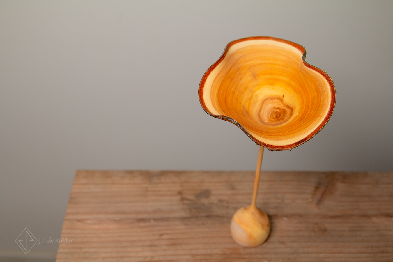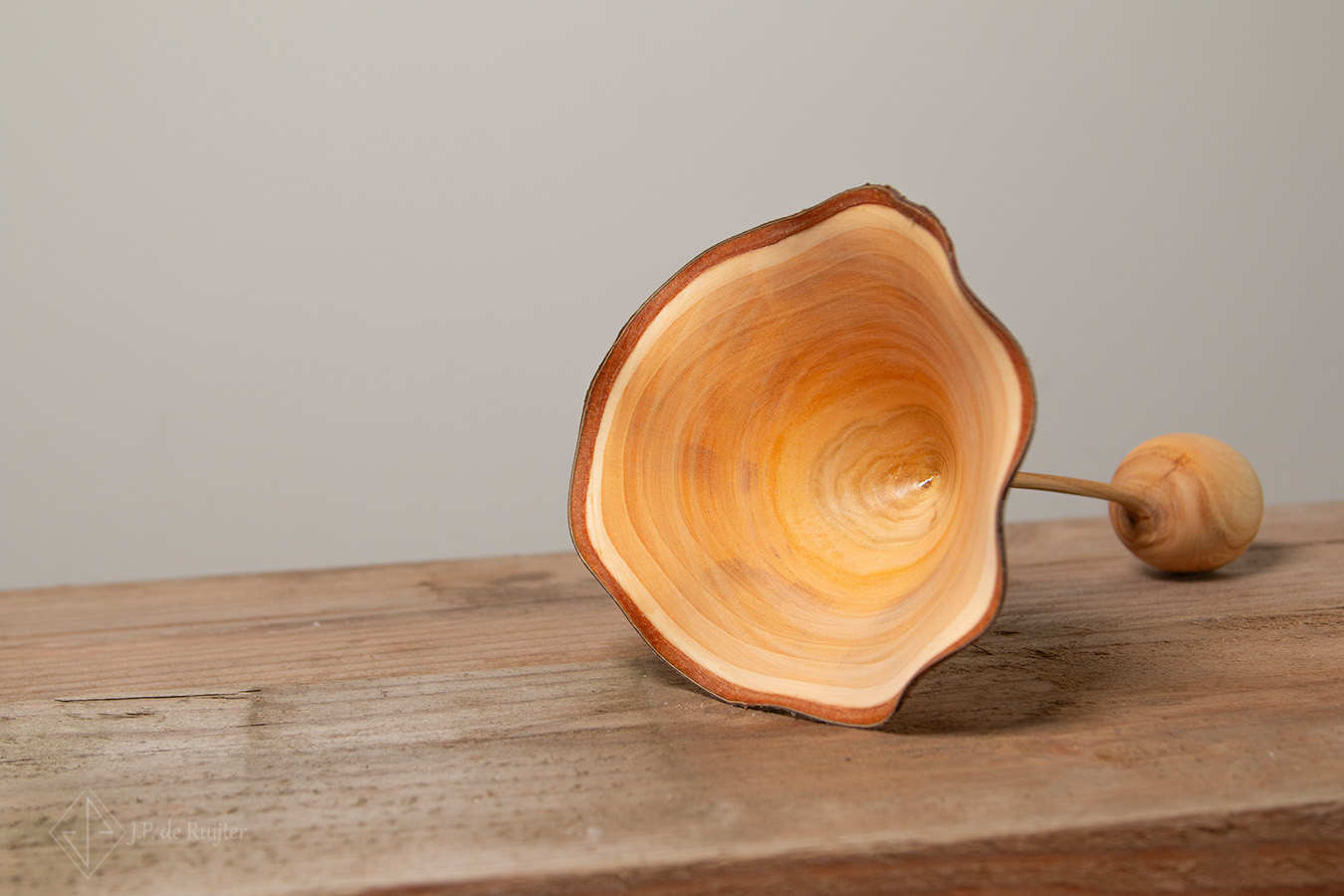 Met mooi gevormde jaar ringen, die zijn goed zichtbaar. Een mooi licht bruin hart, en de bast zit er rondom nog omheen.