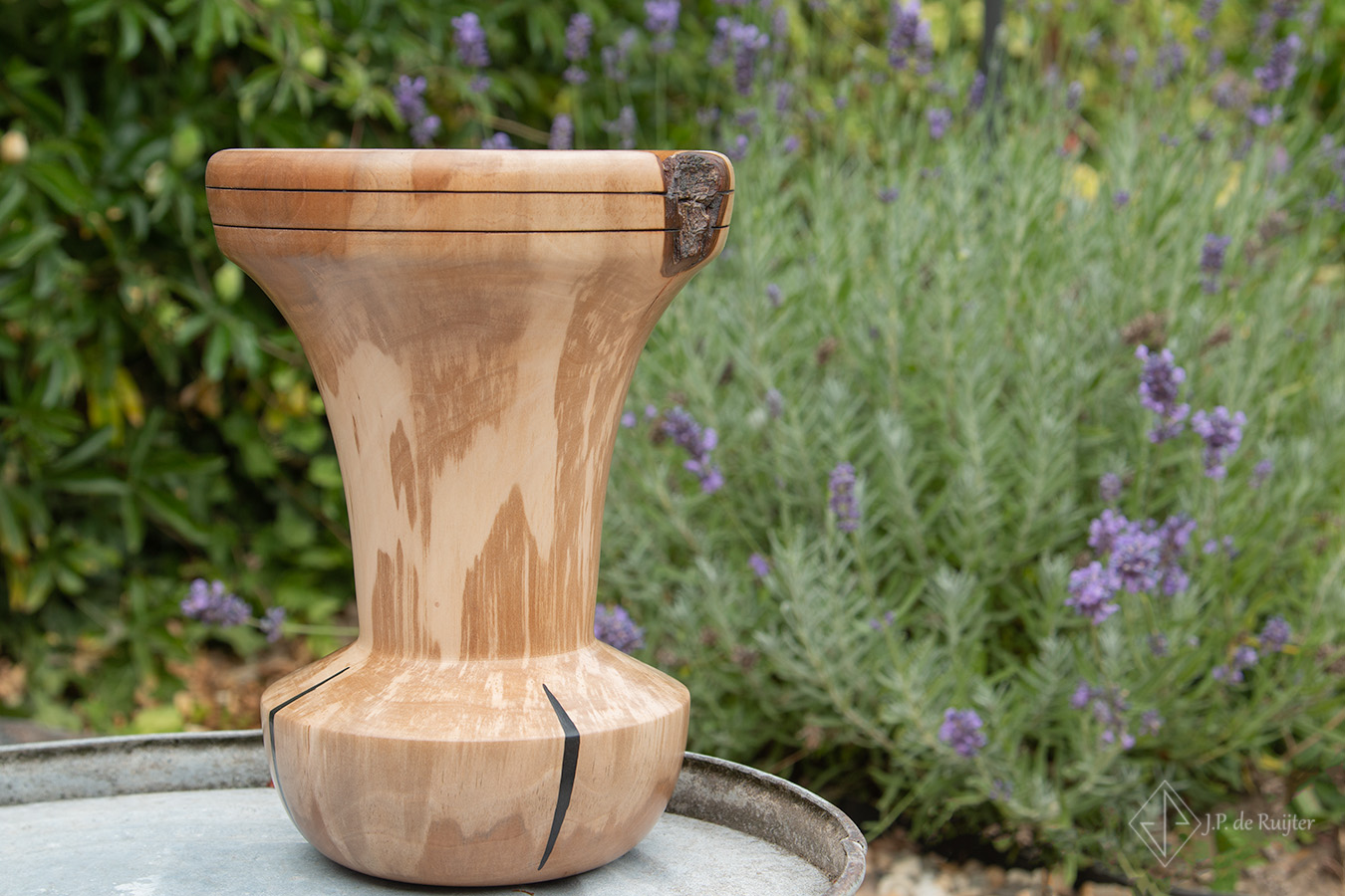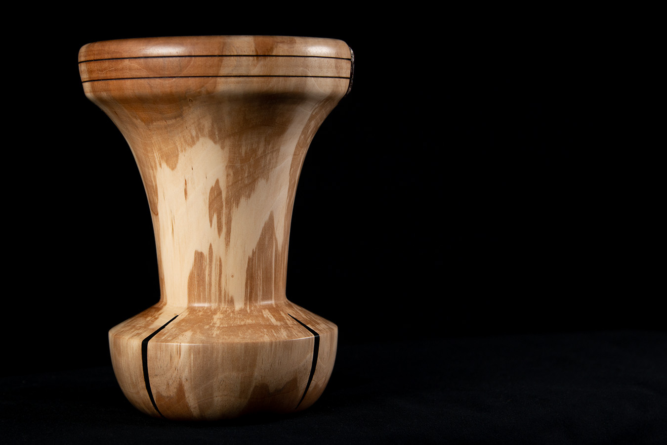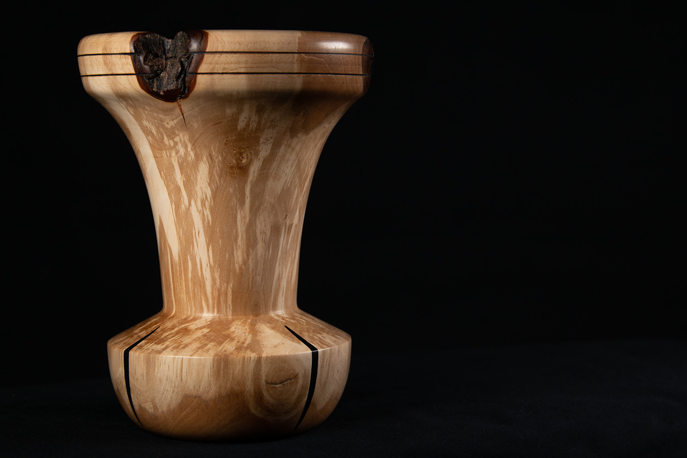 Vaas van gevlamt peren hout met zwarte accenten.