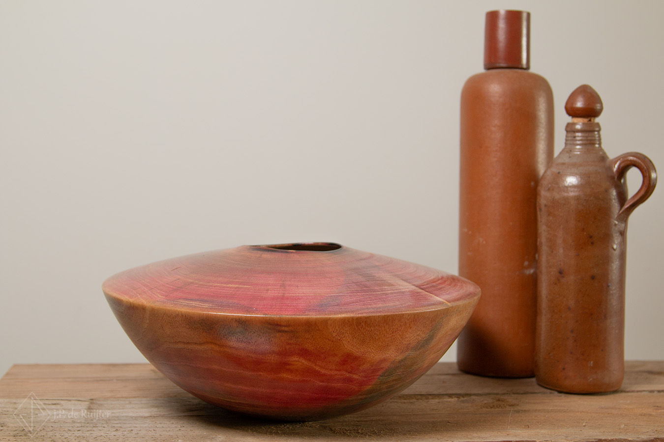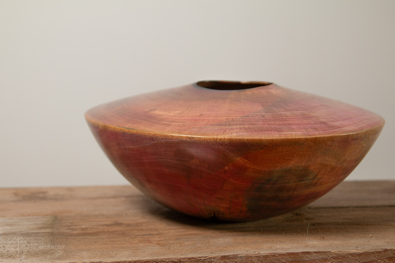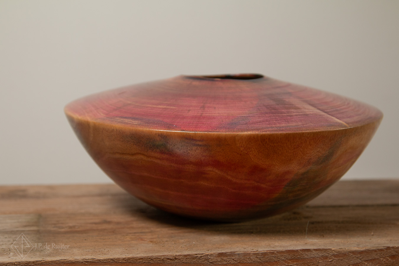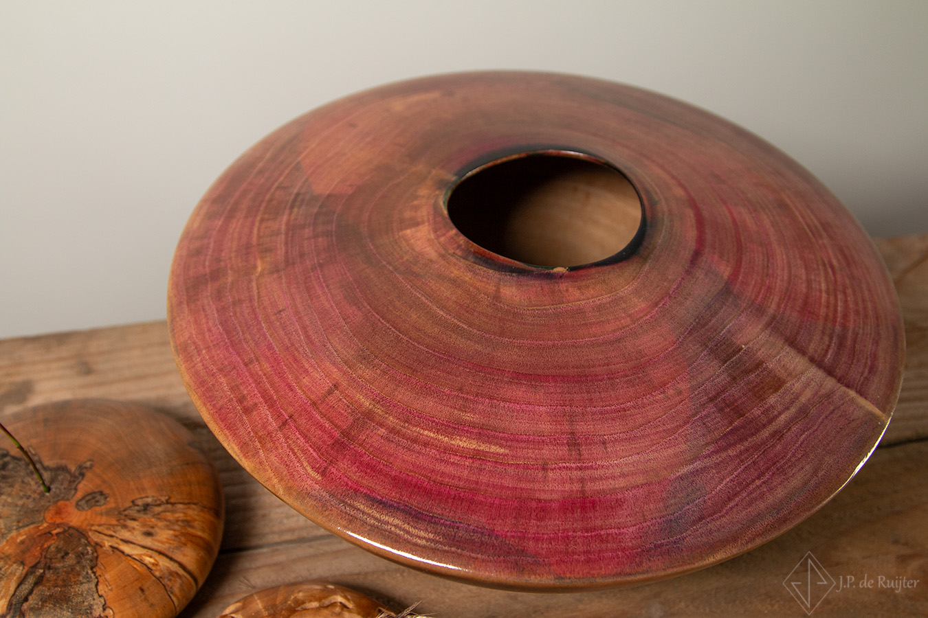 Vaas in schaal of ufo vorm. Gemaakt uit walnotenhout uit de regio. Gekleurd met magenta en syaan.