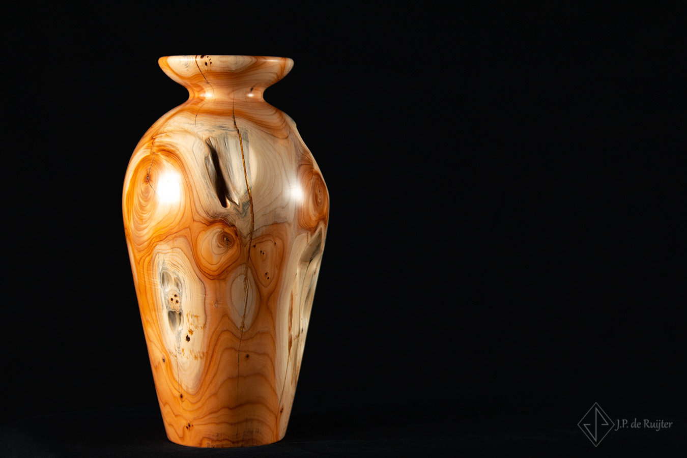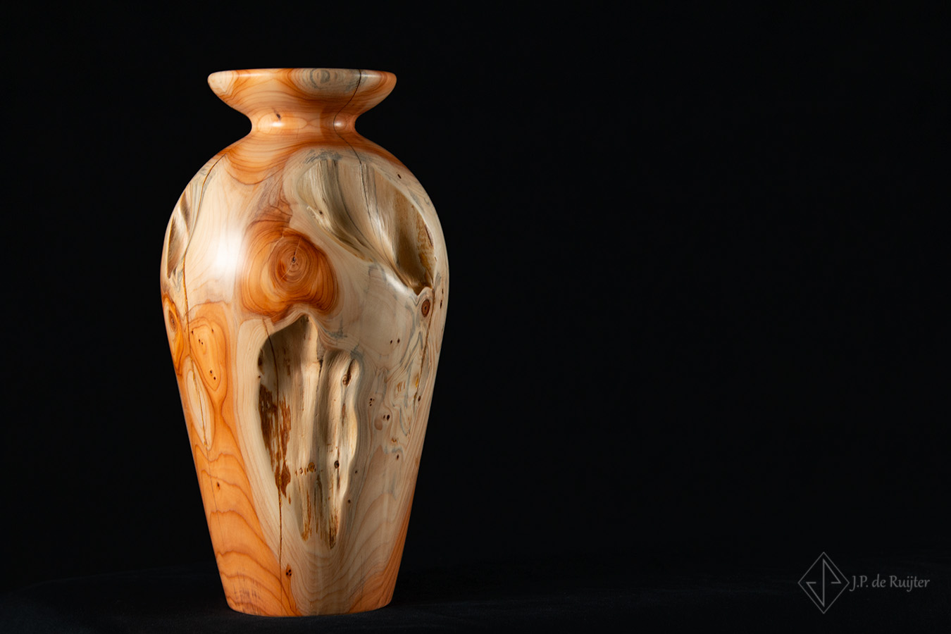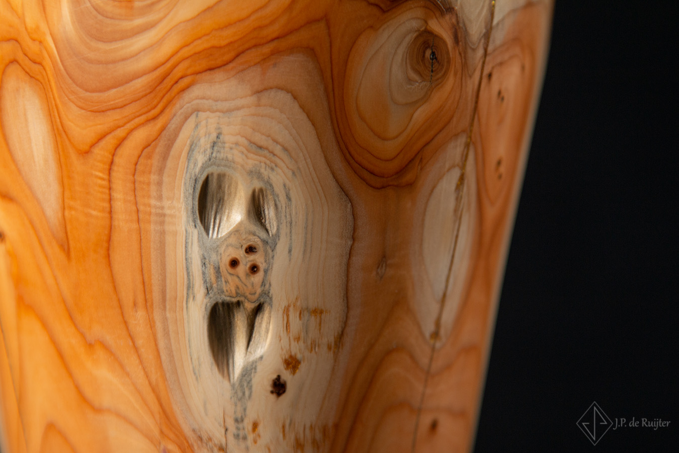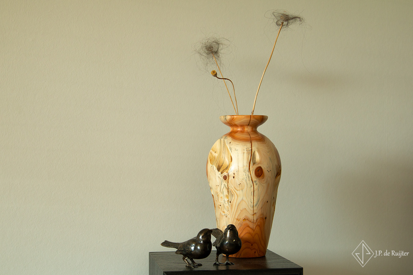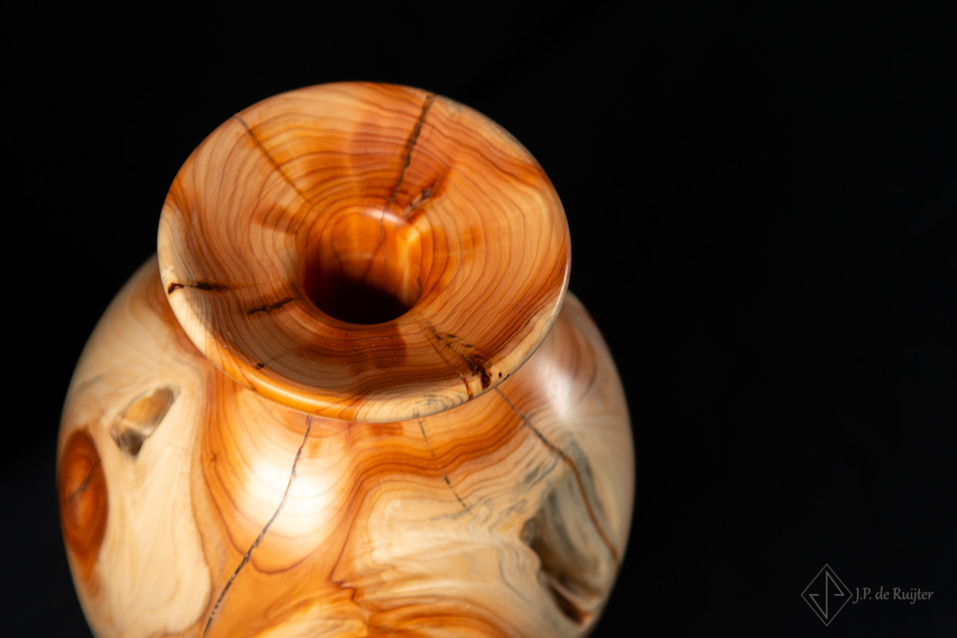 En niet alleen de kleuren ook de vormen in het hout maken deze vaas uniek.