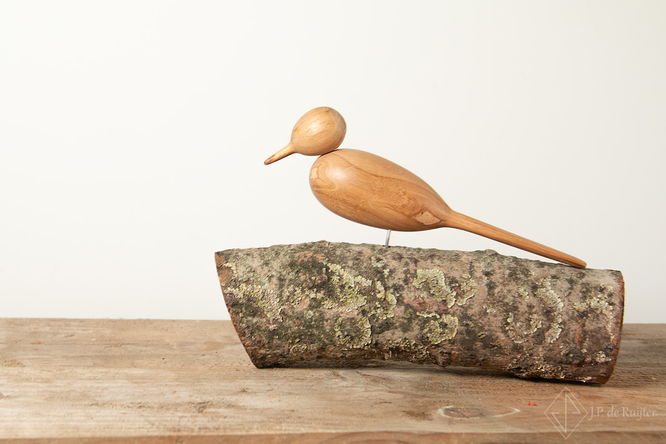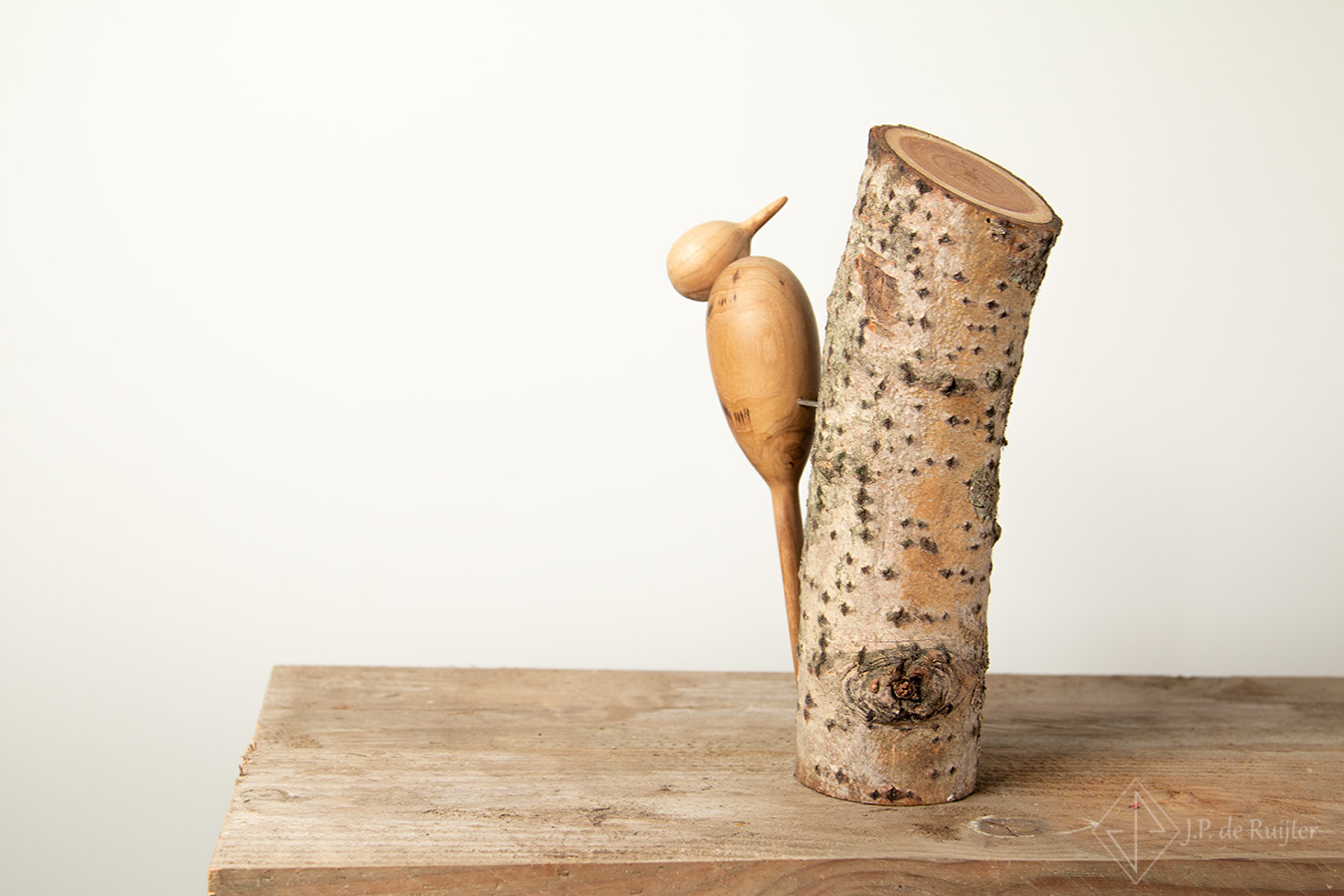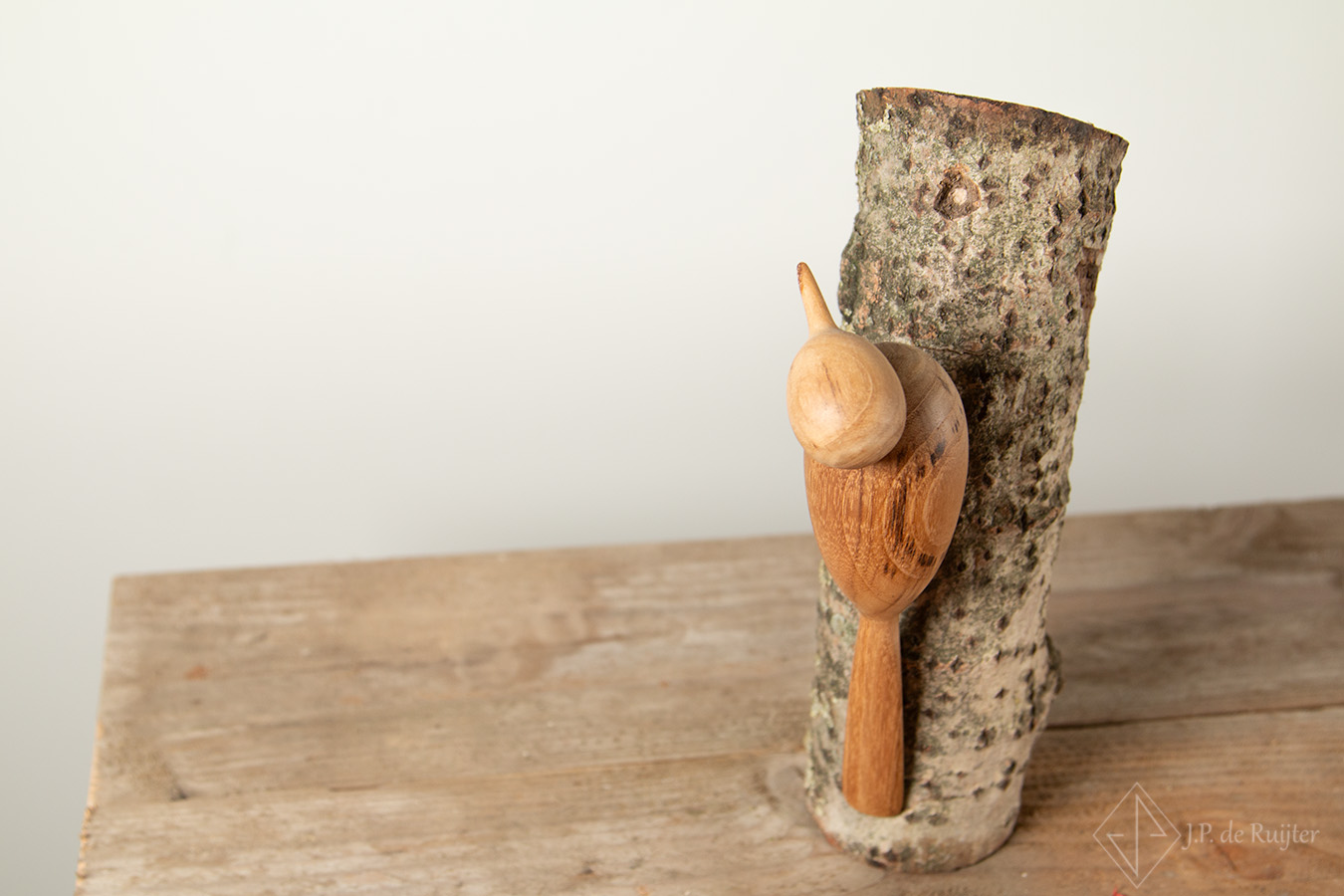Deze specht uit oud eiken hout op een stammetje van kersen hout,