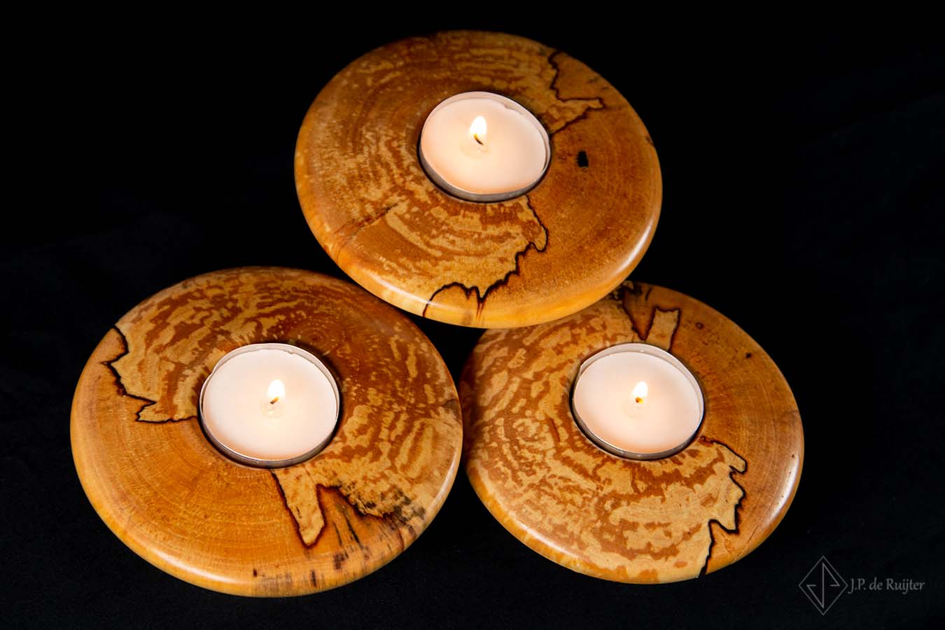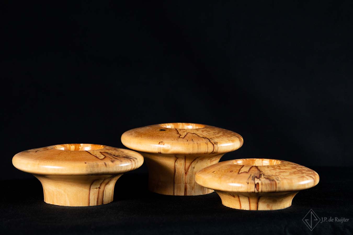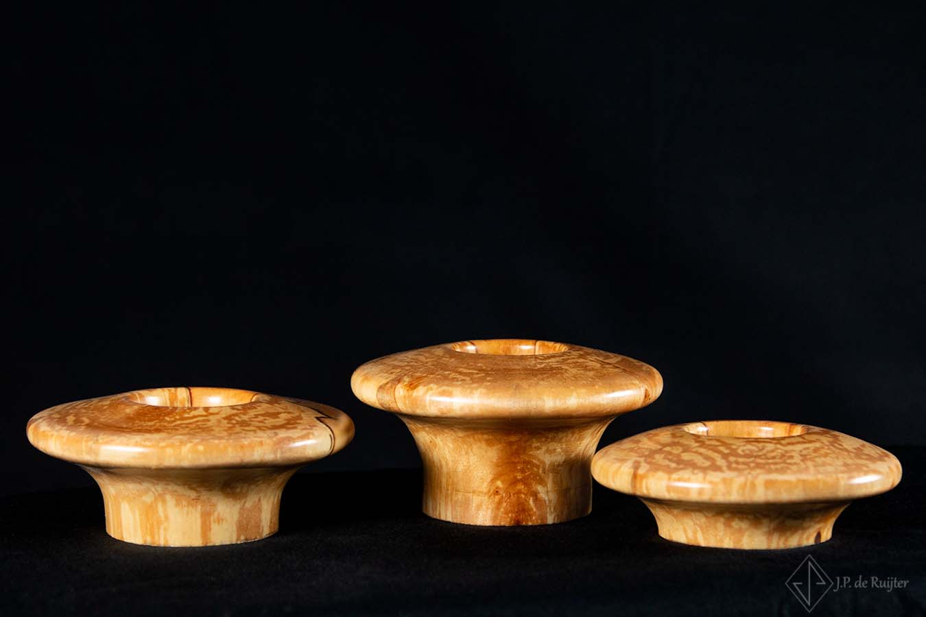 Waxinelichthouder set van 3, ufovormig in verschillende hoogte van Berken hout.